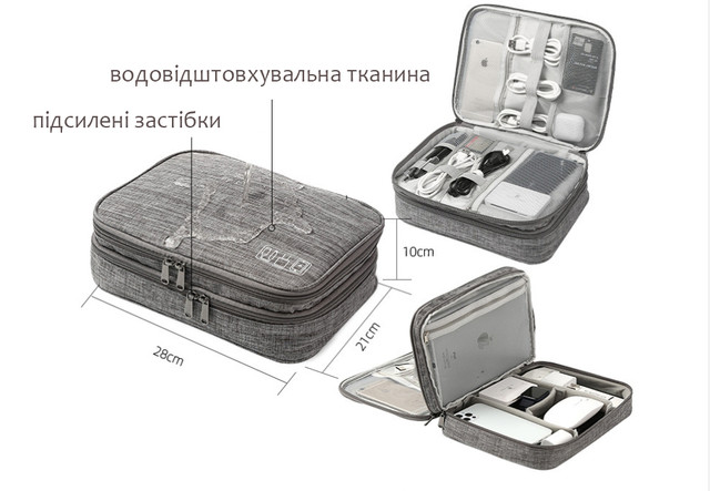 Сумка-органайзер для електронних аксесуарів, зарядок, флешок, PowerBank виготовлена у формі портфеля середніх розмірів (висота 210 мм*ширина 280 мм*глибина 100 мм), має два відділення, які закриваються на блискавку. У першому відділенні є дрібні кишені та затискачі для кабелів, дротів, флешок, презентерів, навушників, карт пам'яті, тестерів напруги та ін. Для них є п'ять дрібних кишень з сітки, фіксатори з гумок, дві кишені на блискавці. У другому відділенні передбачений глибший простір, а також додаткові тканинні перегородки на липучках для створення дрібніших відсіків. Під час закріплення цих перегородок на липучки можна розділити всі відділення на 4 відсіки. У них зручніше зберігати зарядки, PowerBank, мишку, великі кабелі.