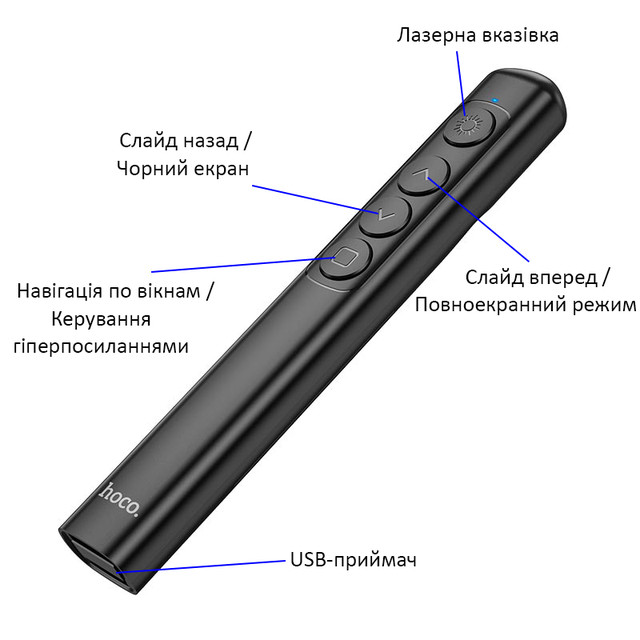 Працює пульт для презентацій Hoco GM200 по радіоканалу через бездротовий USB-приймач 2,4 ГГц, який фіксується в нижній торцевій частині презентера за допомогою магніту, що дуже зручно. Радіус дії бездротового сигналу досягає 100 метрів на відкритому просторі, тому можете не турбуватися про розміри залу для презентацій і віддаленості від джерела сигналу — ноутбука або ПК.
